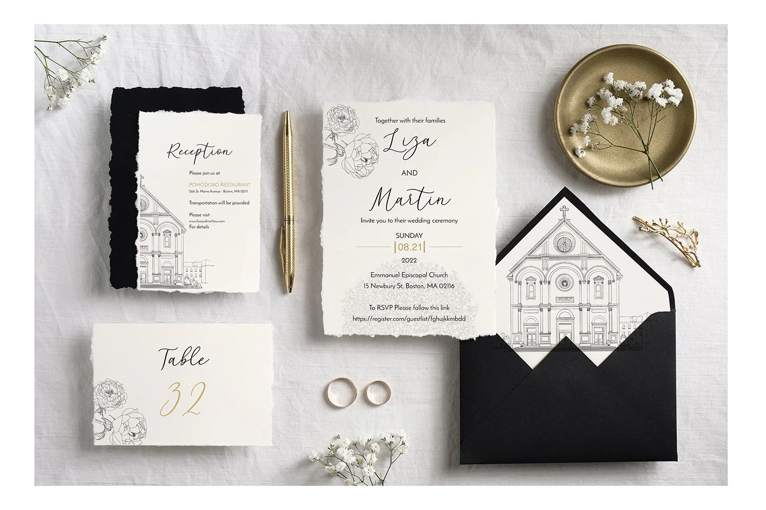 A7 set: Printed on 135lb/290gsm premium hand deckled stock, A9 baronial black mailer envelope, A7 baronial back envelope with envelope liner, Details card, Escort card or Table number card, 4-bar RSVP black envelope, custom designed floral monogram seal, Complimentary Giclée print of the venue.