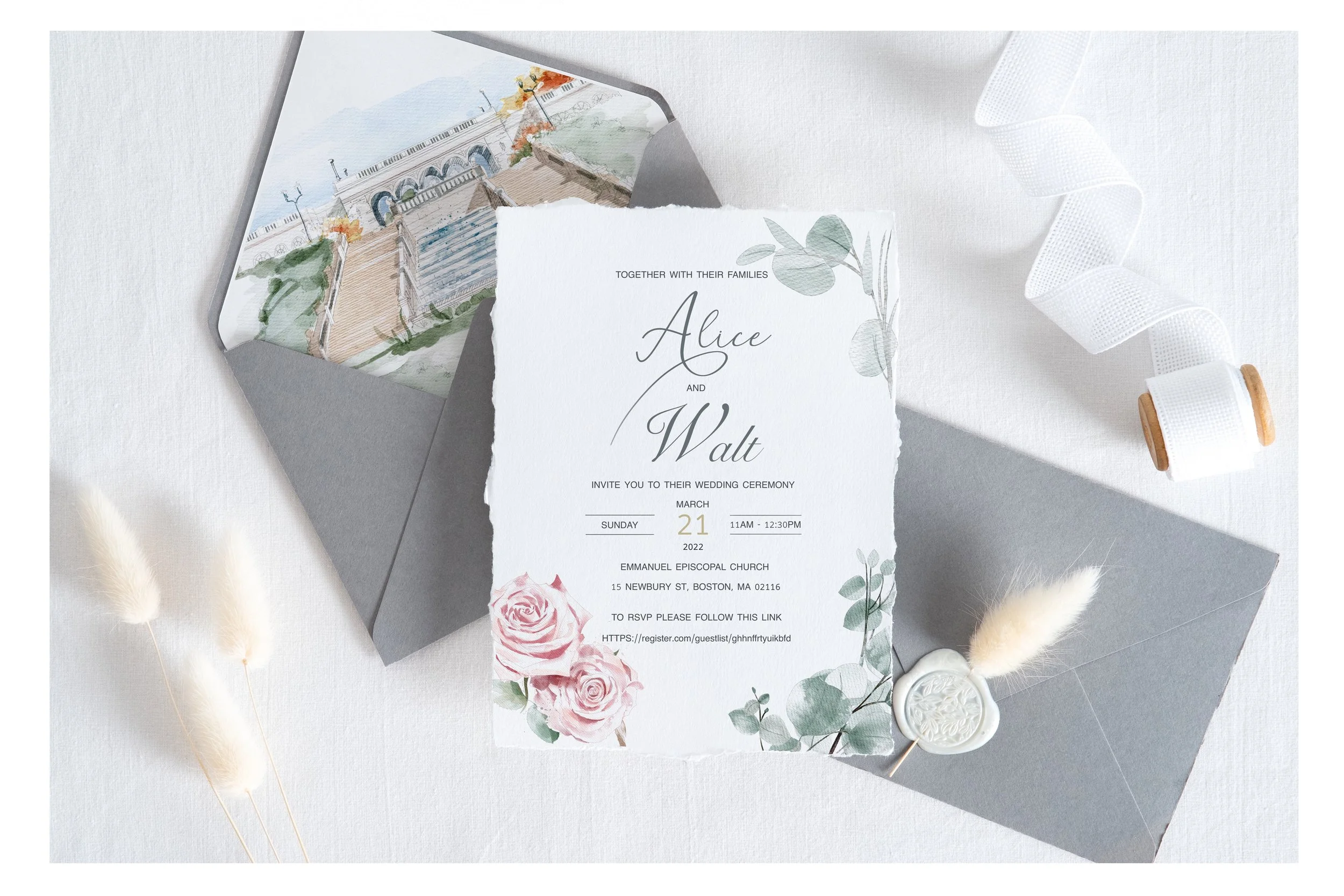 Garden Rose SuiteA7 set: Printed on 135lb/290gsm premium hand deckled stock, A7 baronial pale gray envelope with envelope liner, custom designed floral monogram seal. Complimentary Giclée print of the venue. View fullsize View fullsize