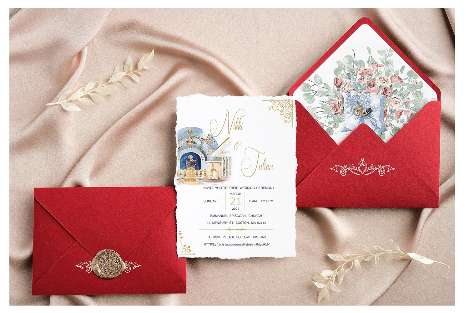 A7 set: Printed on 135lb/290gsm premium hand deckled stock with foil accents, A9 baronial red mailer envelope, A7 baronial red envelope with envelope liner and white ink calligraphy motif, custom designed floral monogram seal, Complimentary Giclée print of the venue.